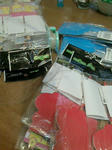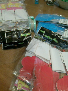 運動会の小学生参加賞の景品にのしを作り、貼りつける作業中。